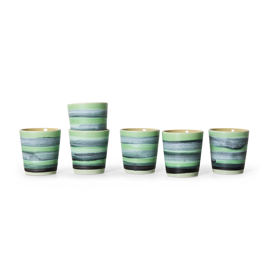 Layered bands of green, grey and soft blue give this mug its distinctive, flowing character. The glaze appears almost landscape-like, shifting subtly with every angle. A striking yet harmonious design that makes even a quick coffee feel considered.