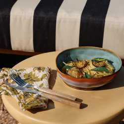 Serve your pasta dish in a unique pasta bowl. Thanks to the retro glazes you've come to expect from 70s ceramics, your table setting will stand out from the crowd. Both the inside and outside of the pasta bowls are glazed to make your food really pop.