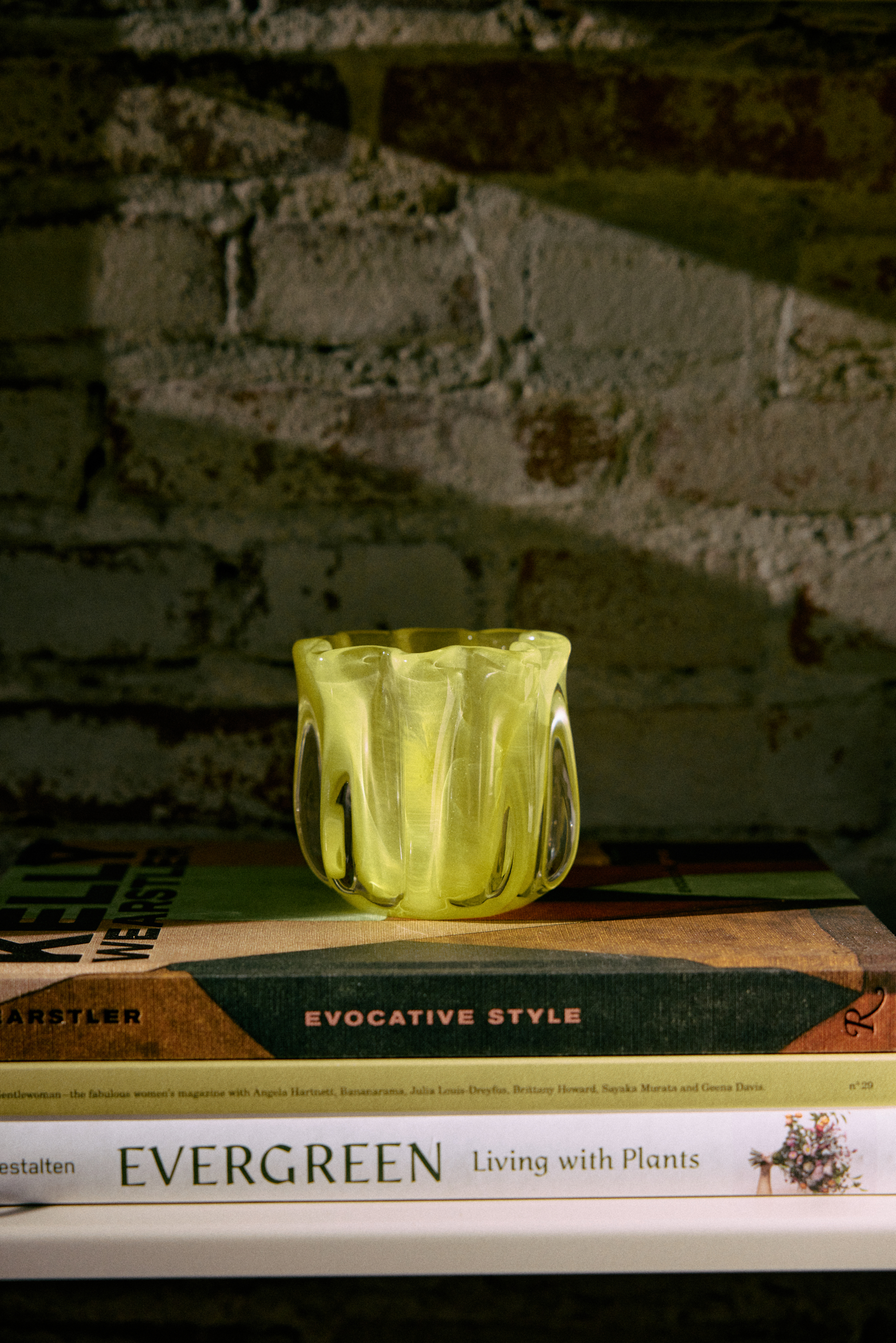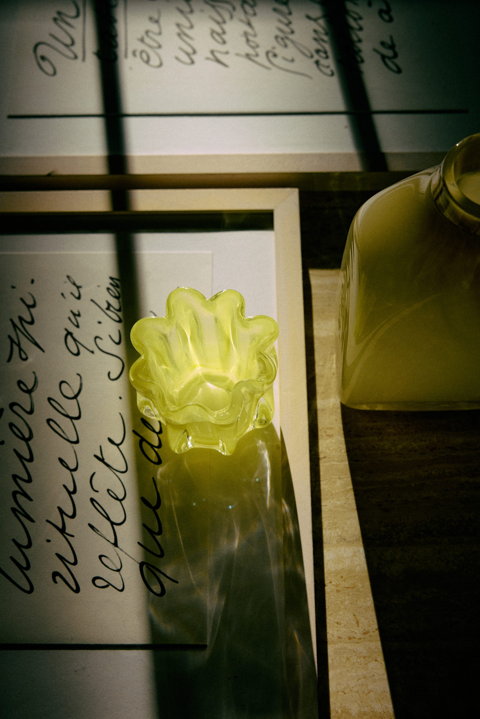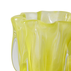 Designed as a study in light and form. This glass tealight holder plays with organic curves and controlled symmetry, echoing the shape of an abstract bloom. Cast in solid glass and finished in a clear, warm yellow, it transforms candlelight into soft reflections and subtle movement. Its weight and presence give it a sculptural quality—an object that grounds a space while quietly shaping the atmosphere around it.