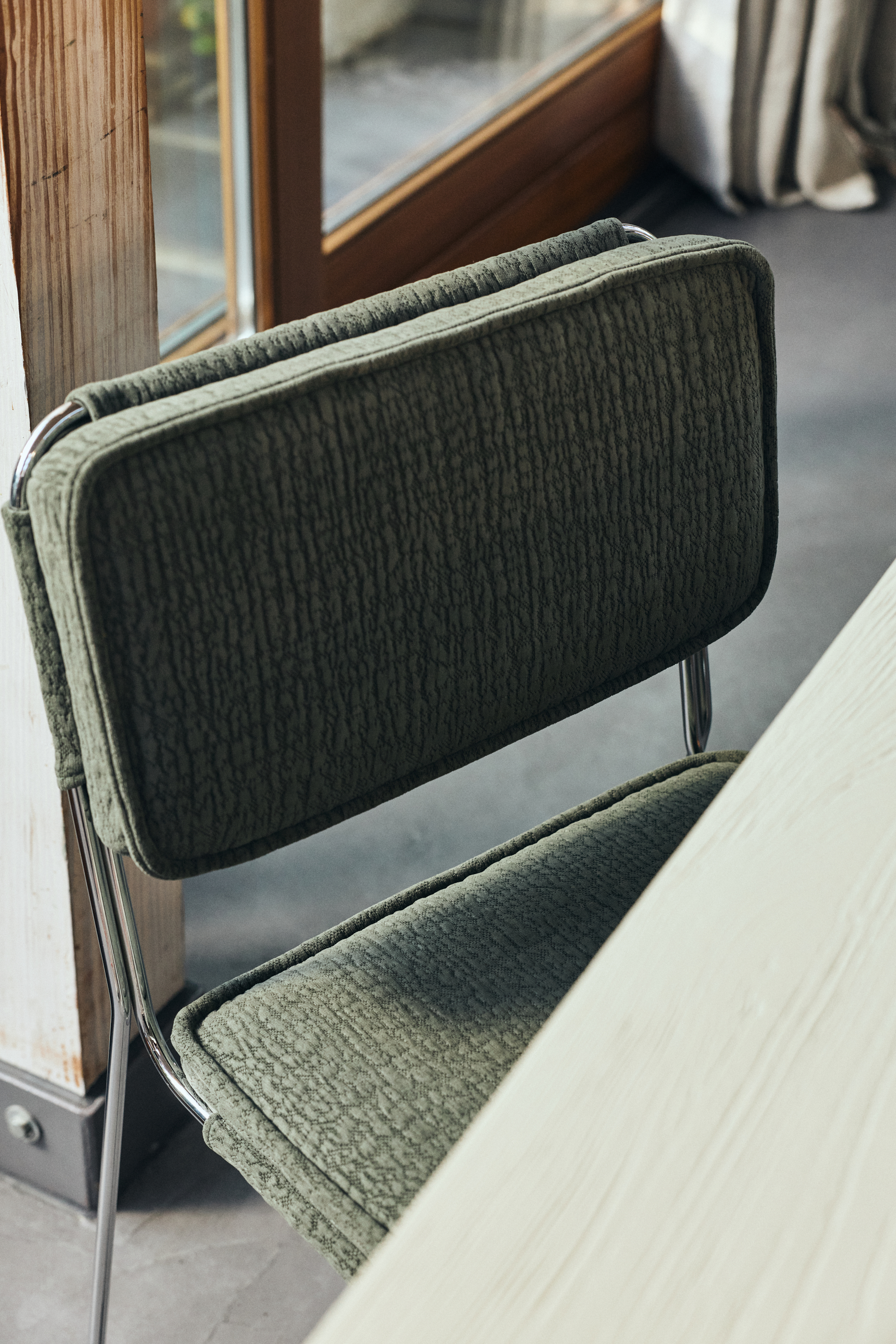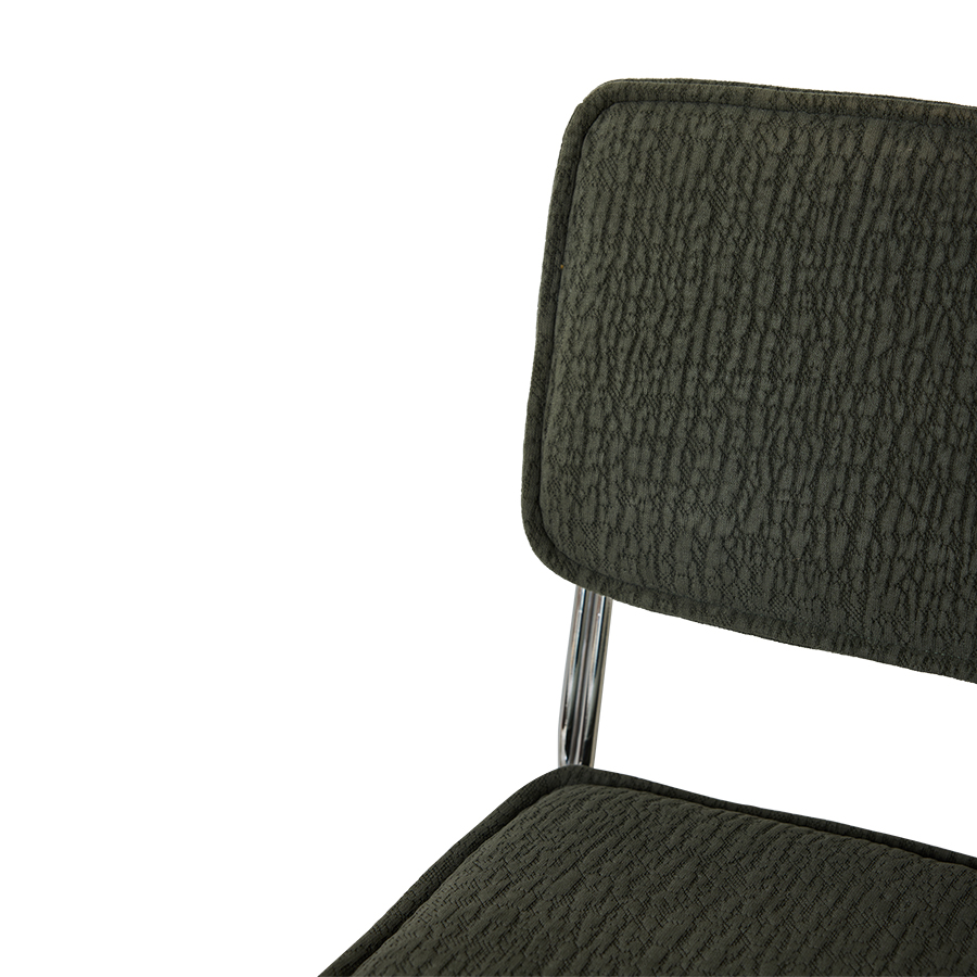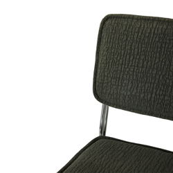 Designed with comfort and character in mind. This dining chair combines a strong, 60s-inspired silhouette with the tactile structure of the Edge fabric. Upholstered in wild olive, it brings a grounded, confident feel to the table. Supportive in seating, expressive in look—a timeless design that feels considered from every angle.