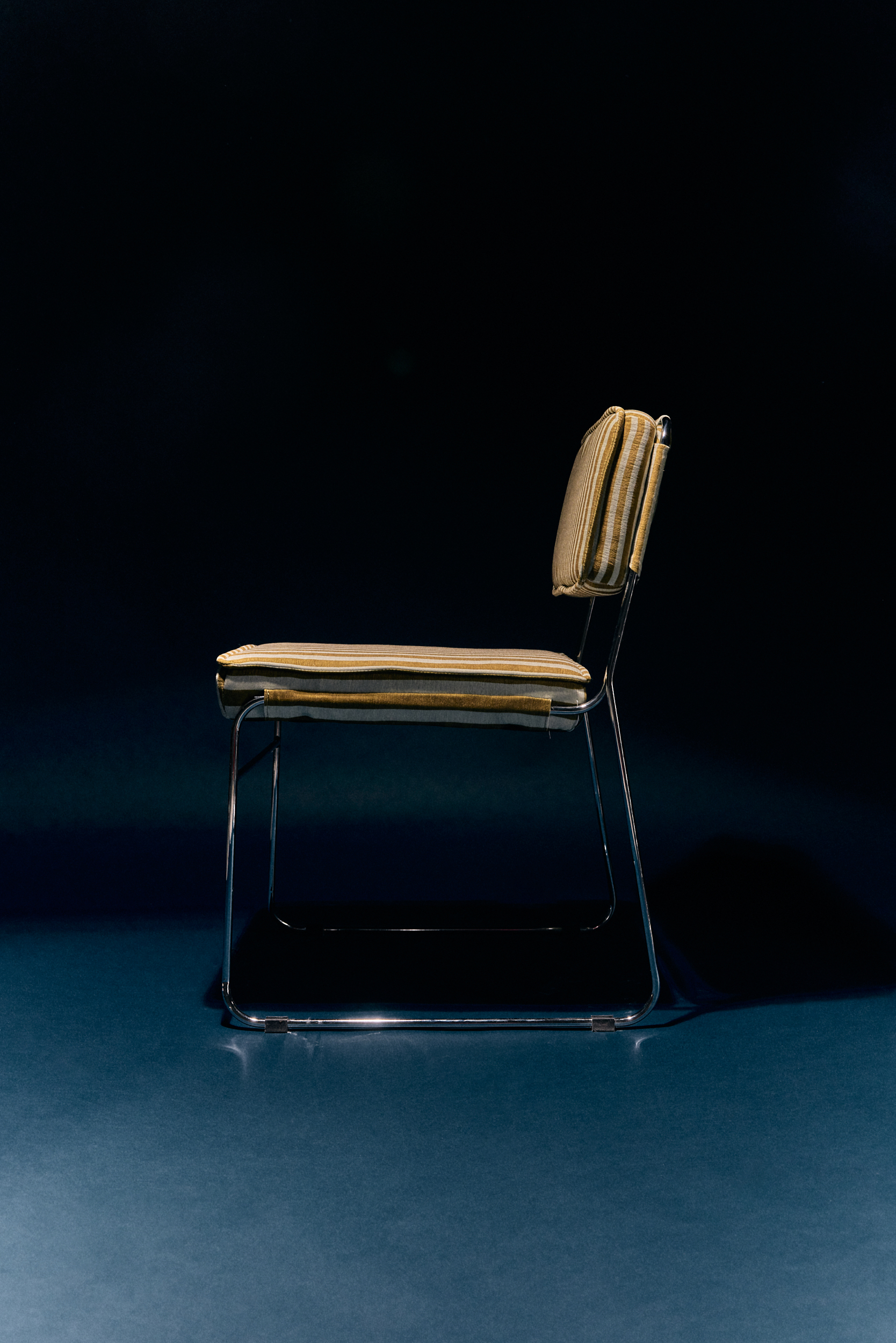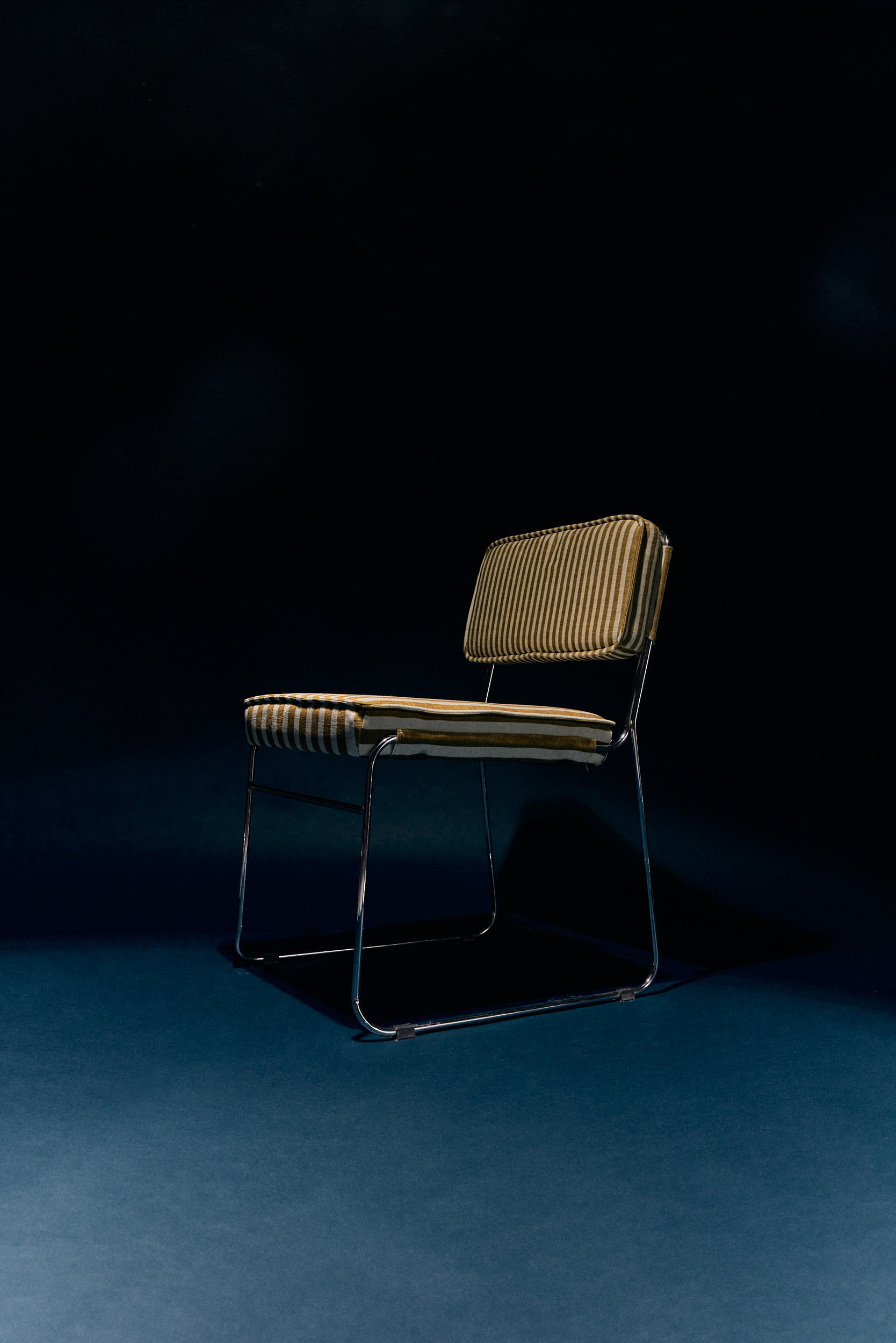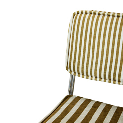 A confident play on contrast and colour. Upholstered in the Stripe fabric in sunflower tones, this dining chair brings light and energy to the table. The graphic pattern nods to modern design, while the warm yellow accents add character. Strong in form, comfortable in use, and unmistakably expressive.