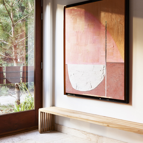 10% Pine wood stretched Bar + 70% linen cavas and Acrylic Paint, 15% Acrylic Frame, 5% metal Hardware