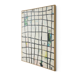 Wired is a large-scale canvas that explores contrast through restraint. A white-painted surface is intersected by a strict grid of black horizontal and vertical lines, occasionally disrupted by loose traces of colour. The result feels architectural and controlled, yet never static. Framed and commanding in size, this artwork anchors a space with clarity and quiet intensity.