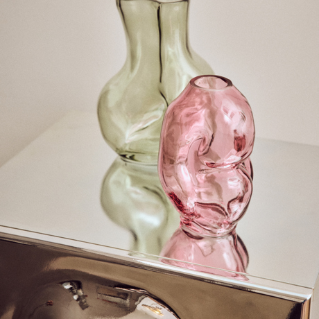 Make a bold statement with this chrome glass vase. Its reflective surface and organic shape blend nature’s fluidity with a contemporary edge. Use it as a striking centrepiece or pair it with other pieces for a layered display.