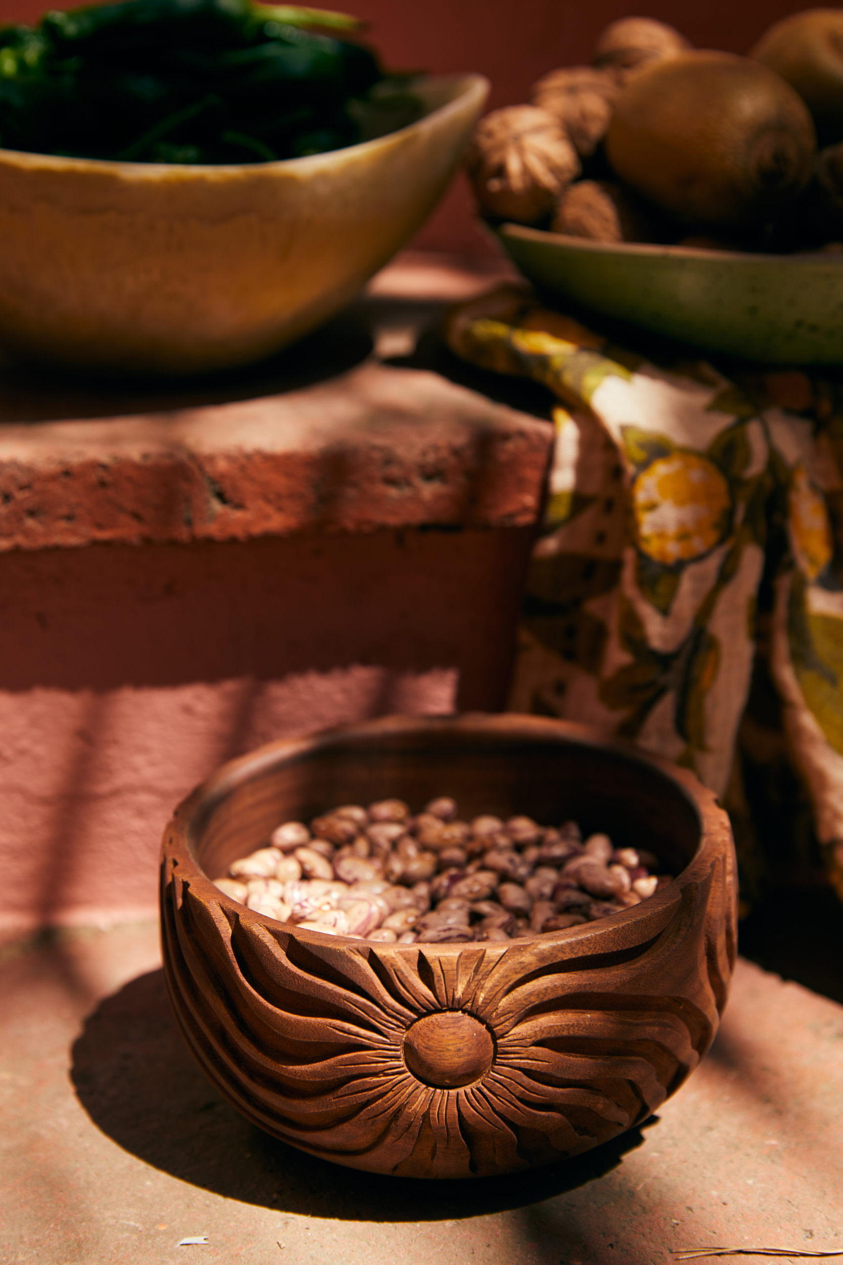 This hand-carved wooden bowl is a practical and distinctive addition to your home. Featuring a sun-inspired design with textured details, it’s perfect for storing small items, serving snacks, or simply adding a unique touch to your space. The natural wood grain and sturdy craftsmanship make this bowl a reliable choice for everyday use.