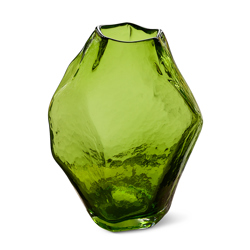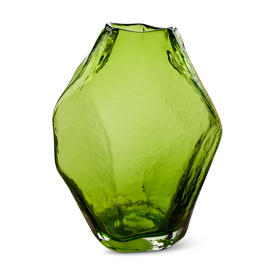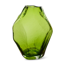 Shaped like an oversized gemstone, this glass vase balances sharp definition with soft, faceted surfaces. The gently angled planes catch and bend the light, giving the piece depth and movement from every viewpoint. Sculptural in presence yet functional in use, it stands confidently on its own or as a vessel for branches or flowers — a statement object that feels both refined and raw.