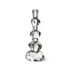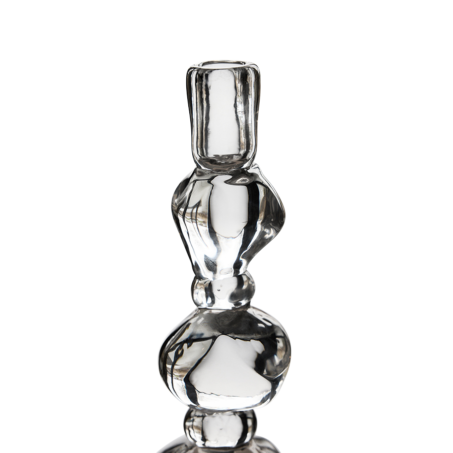 Built from stacked, gem-like forms, this glass candle holder plays with weight and light in a way that feels almost deceptive. Solid and reassuring in hand, yet visually light, it catches daylight and candlelight alike, scattering reflections across the room. The sculptural silhouette turns a simple flame into a small focal point — quiet during the day, luminous once lit.