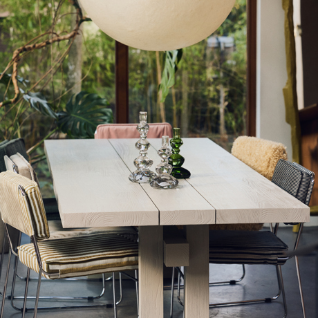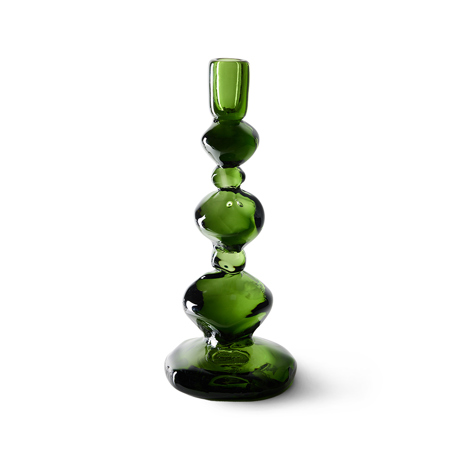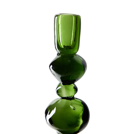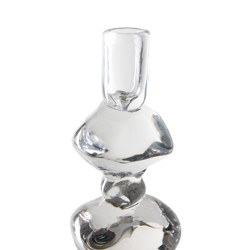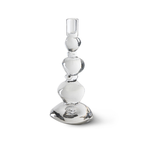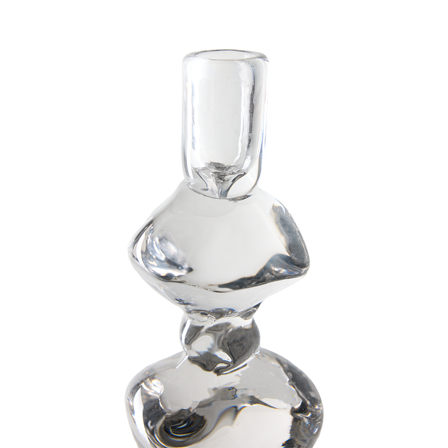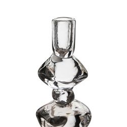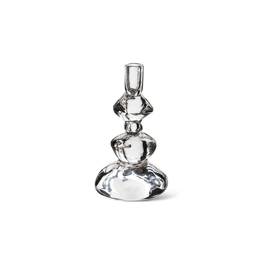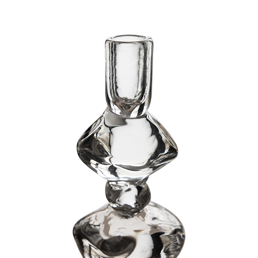 Built from stacked, gem-like forms, this glass candle holder plays with weight and light in a way that feels almost deceptive. Solid and reassuring in hand, yet visually light, it catches daylight and candlelight alike, scattering reflections across the room. The sculptural silhouette turns a simple flame into a small focal point — quiet during the day, luminous once lit.