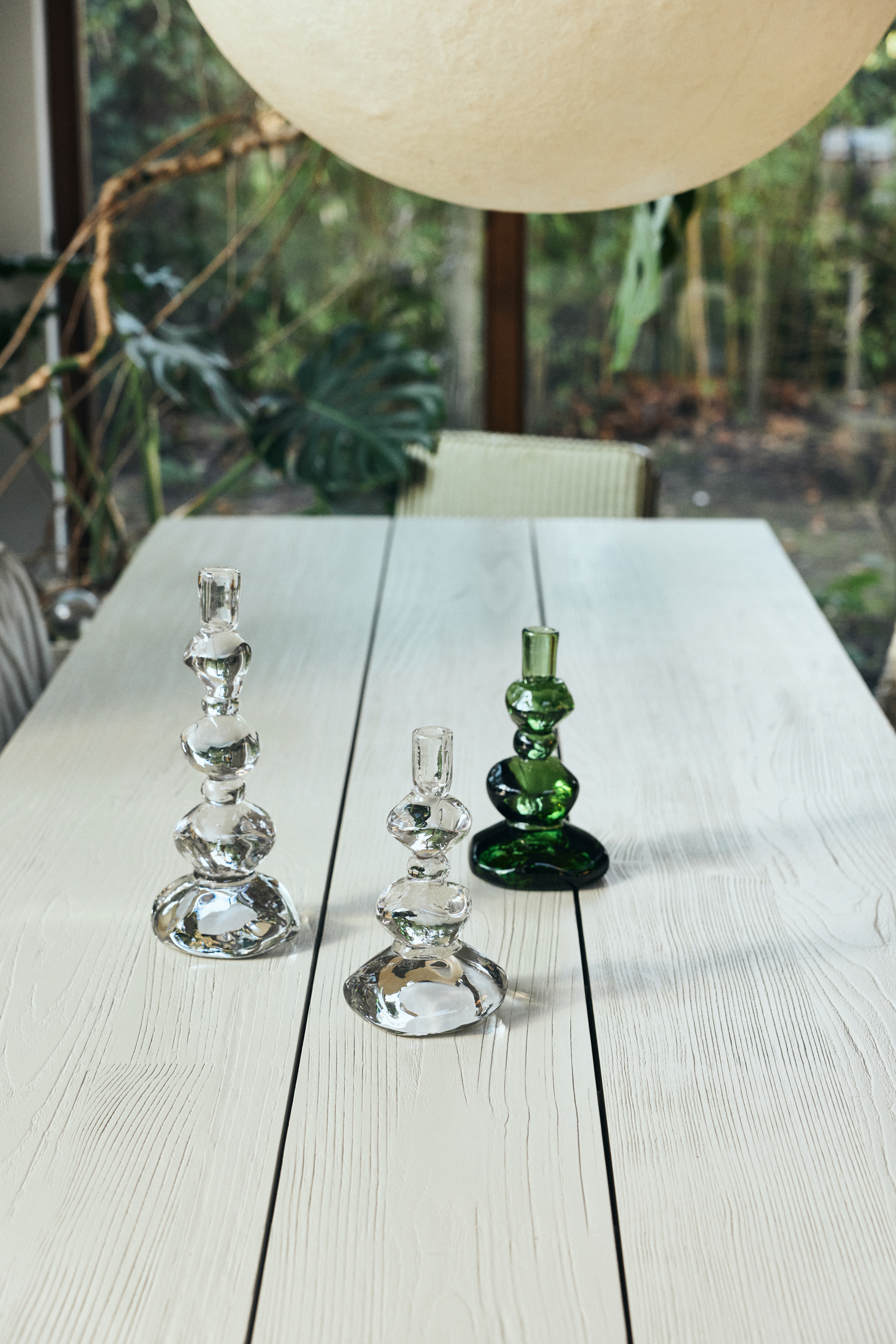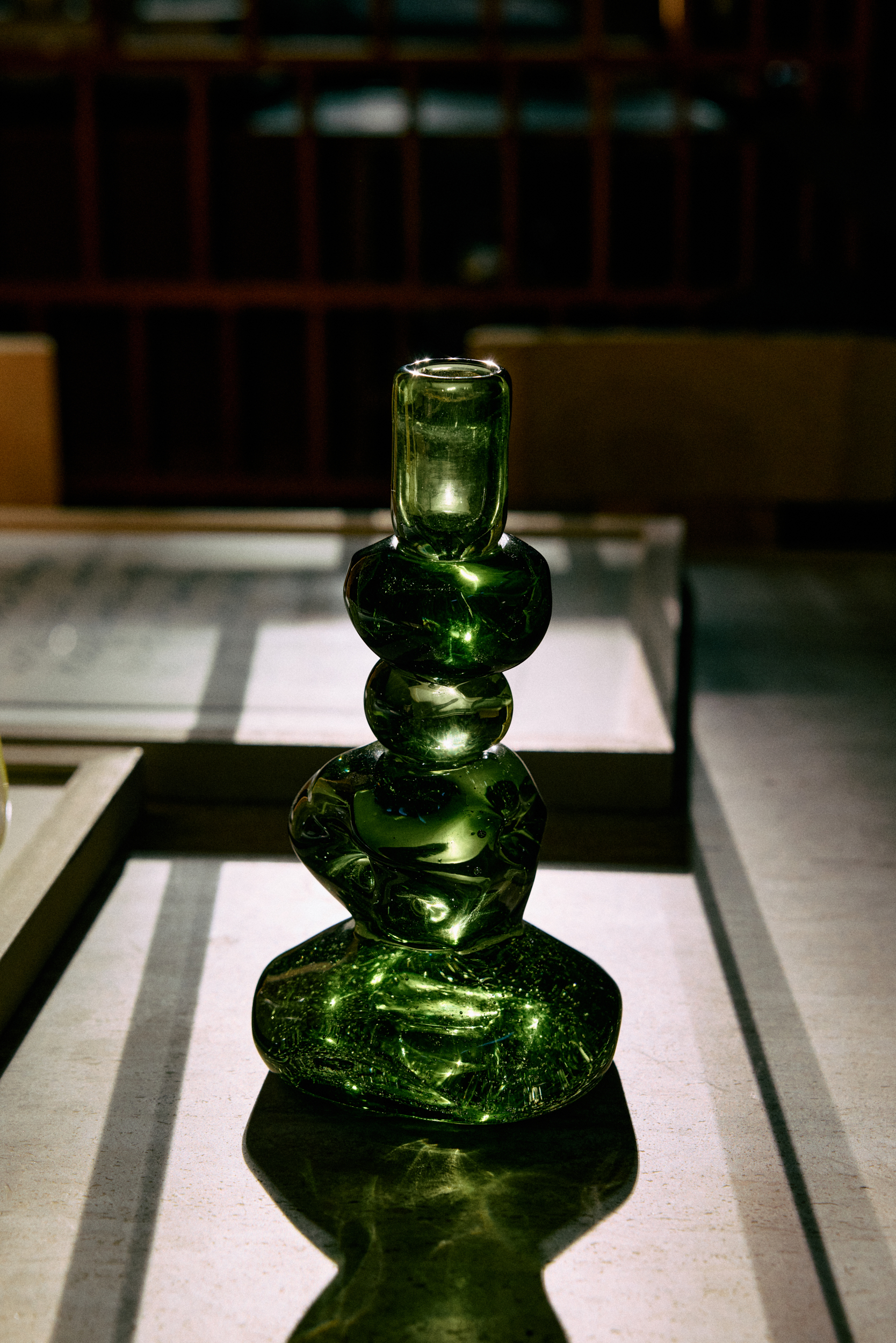 Built from stacked, gem-like forms, this emerald glass candle holder plays with weight and light in a way that feels almost deceptive. Solid and reassuring in hand, yet visually light, it catches daylight and candlelight alike, scattering reflections across the room. The sculptural silhouette turns a simple flame into a small focal point — quiet during the day, luminous once lit.