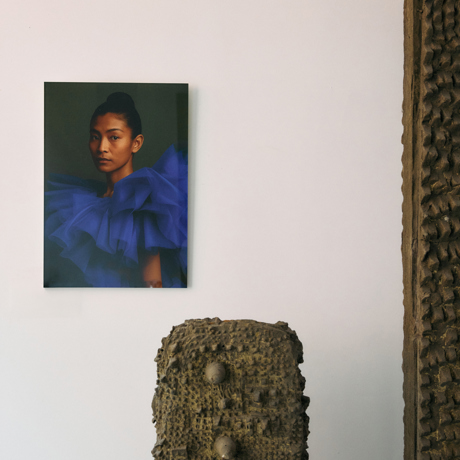 Part of a series of AI-generated portraits, Reverie is a photographic portrait that blends softness with structure. The model’s sculptural lilac garment, captured against a warm ochre backdrop, feels both futuristic and regal. Printed on frameless plexiglass, it becomes a clean, contemporary object.