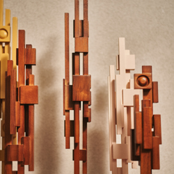With its brutalist form and playful composition, this ornament is a striking accessory inspired by the skylines of the city. Available in different sizes and variations, all made from teak wood.