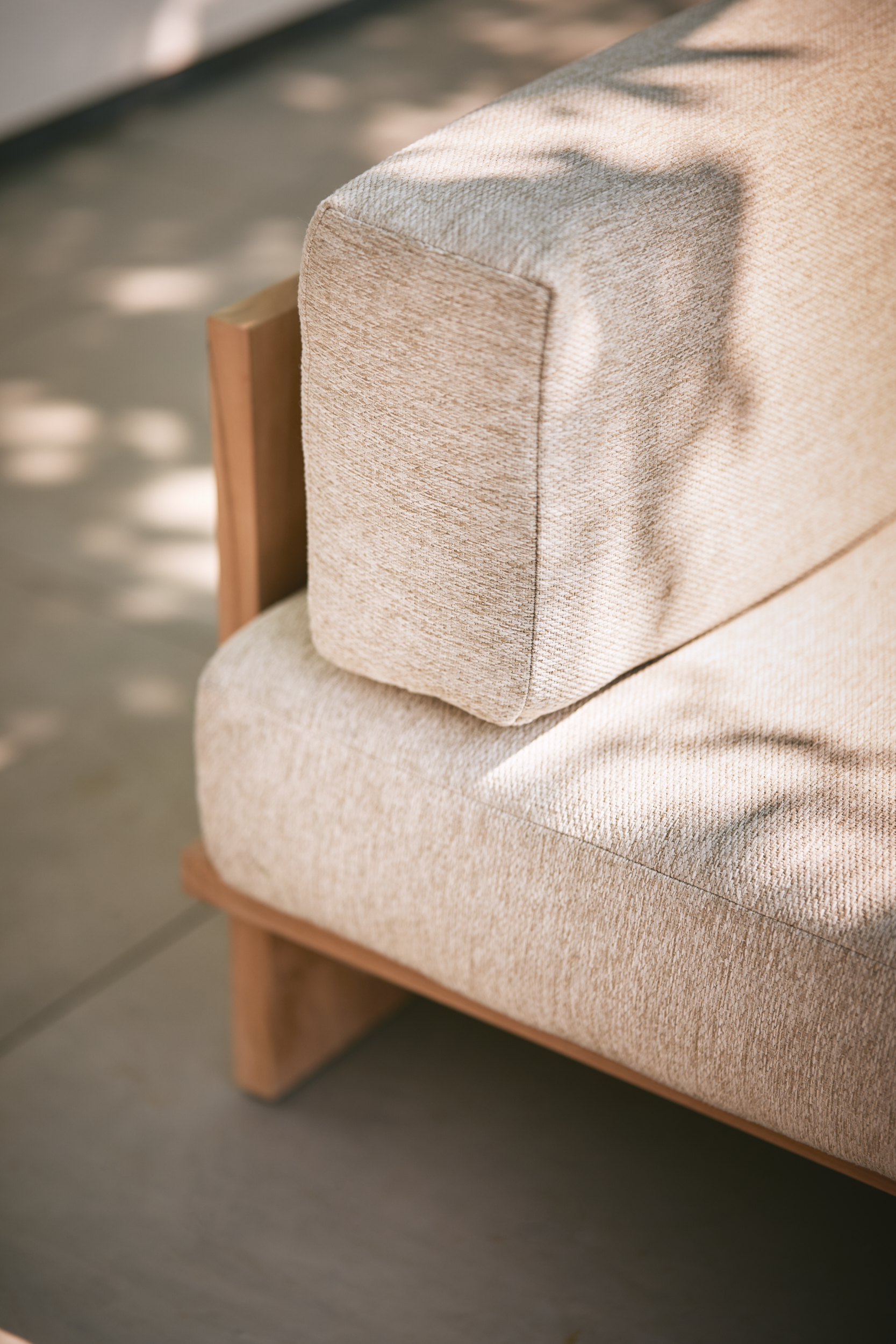 Fabric covering specifications natural: - Covering composition: 100% Olefin - Material weight: 450 g/m3 - Abrassion resistance: 15.000 cycles, martindale - Pilling resistance: (EN ISO 21945-2) 2000 rubs - Flammability: (BS EN 1021-1:2006 Cigarette) - Colour fastness to light: class 4 Frame: - 100% teak wood Filling: - Back cushion filling: D40 foam, dacron - Seat cushion filling: D40 foam, dacron - Arm pillow filling: dacron Dimensions: - Seat cushion: 110x90x16 - Back cushion: 110x29x16 - Arm rest pillow: 58x20x16