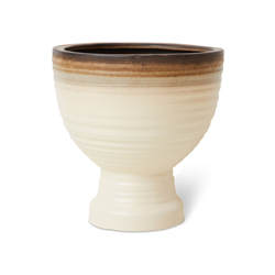 Add an intriguing and voluminous addition to your interior space. The stoneware planter has a rough, tactile surface and a light matt finish, while the curved shape features ribbed, organic lines that are strikingly balanced on a narrow foot, giving the piece a grand yet light expression.